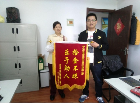 2016年10月20日早上,白沙湾嘉园地库保洁员宋阿姨像往常一样,在地下停车场清扫地面,突然她发现不远处有一个物品,走进一看竟然是钱包,里面有许多证件和现金。保洁员宋春妹将此事上报保洁班长,班长随即找到环境主管。环境主管根据身份证上的信息到客服前台查找,并在业主的群里发布遗失物品领取通知。经过一番努力,物业人员终于找到了丢失钱包的业主。当业主看到失而复得的钱包时,非常感动,一直向保洁员表示感谢。保洁员宋阿姨这种拾金不昧、助人为乐的精神深深地打动了业主。4月21日,这位业主给保洁员宋阿姨送了一面锦旗,再次表达感激之情。